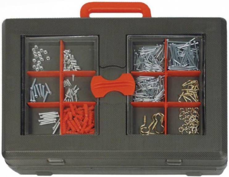 - box met assortiment kleinijzerwaren (spijkers, schroeven, kabelschoentjes, pluggen, haken)